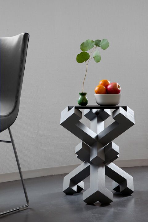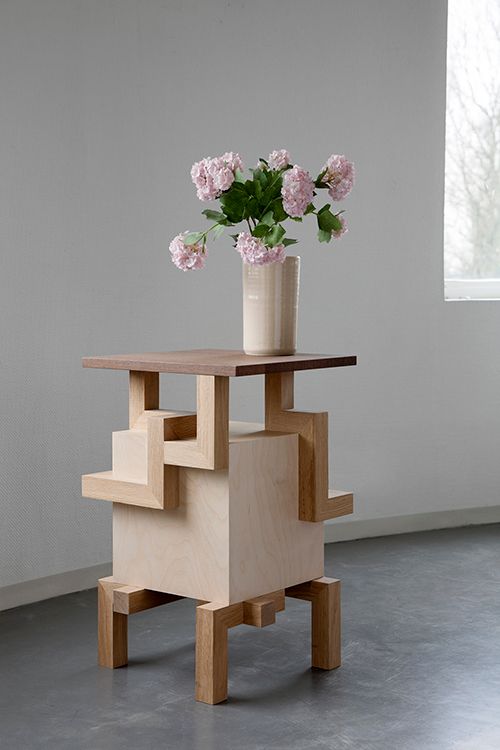 Het creëren van ruimtelijkheid uit het platte vlak is een heimelijk genoegen dat ook terug komt in mijn autonome werk de ‘Kubieken’. Kubieken zijn mathematisch organisch, ze ontstaan vanuit een wetmatigheid. In dit werk wilde ik het doorverwerkte materiaal een verwijzing naar verrijzenis/groei geven, hoe zou een tafelpoot met een groeiafwijking eruit zien. Het verwijzen naar iets met het werk kwam eigenlijk door het herhaaldelijk tegenkomen van termen als ‘biologisch’ en ‘afbreekbaar’. Een bijzettafel is trouwens het meubel waarin ik de meeste vrijheid voor toepassing van vorm vind.