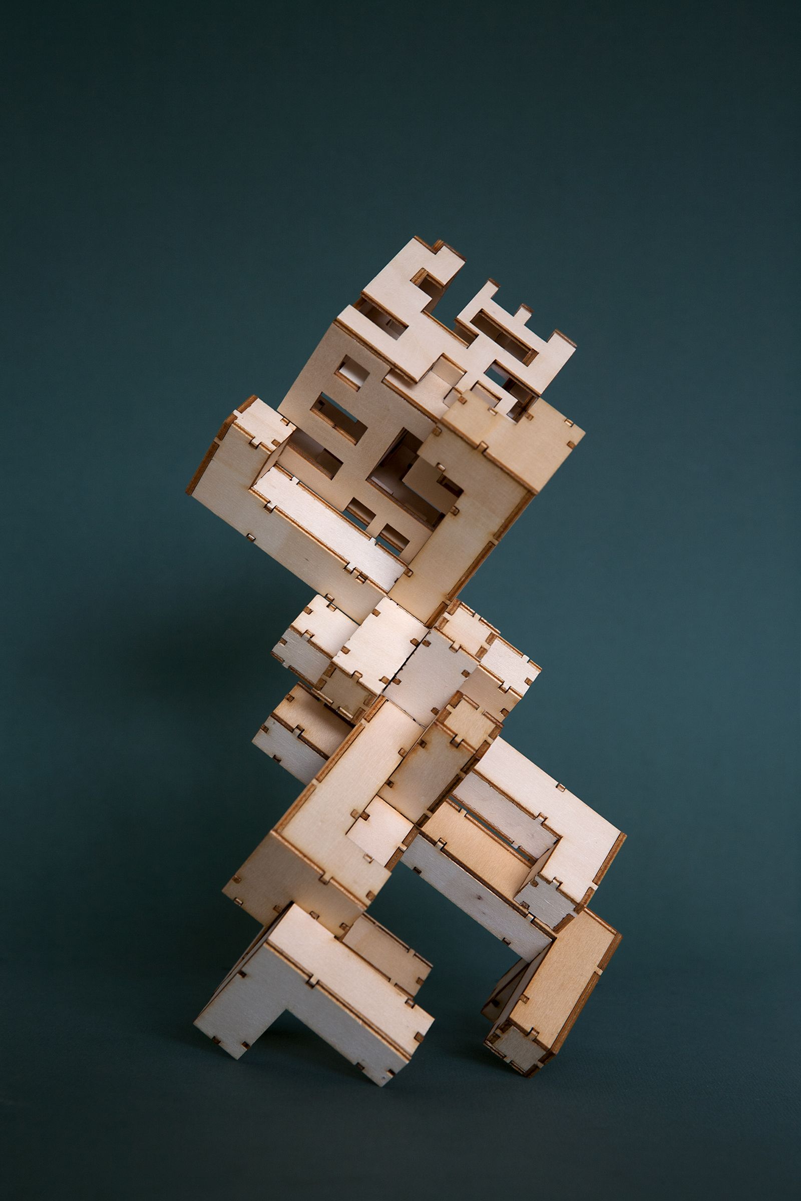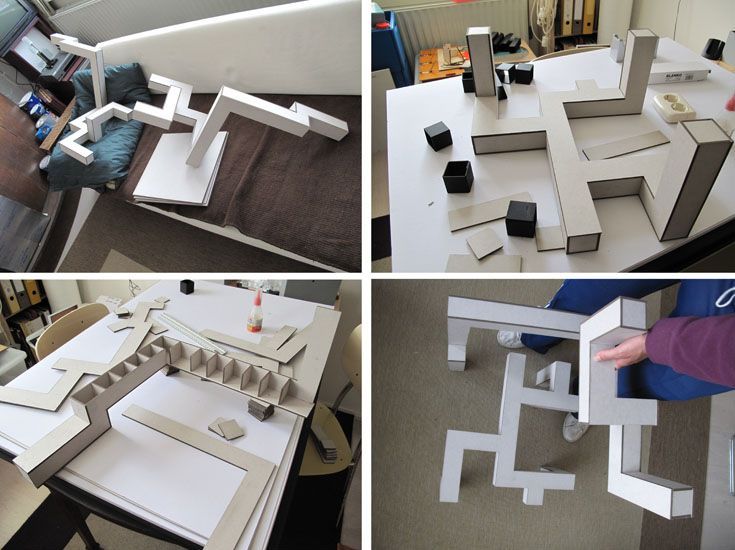 In het kort; ik ga gewoon bezig en de vormen ontstaan omdat ze moeten ontstaan. Ik start met schetsen op papier, of als ik weet wat ik denk dat ik ga maken, komt het voor dat ik ruimtelijk schets. Hiervoor verzamel ik restanten isolatieplaat dat ik in de gewenste maat zaag (meestal 4x4 of 2x2 cm. Met spelden positioneer ik zo de elementen aan elkaar. Als ik een bult resthout heb, doe ik dit ook wel met hout.