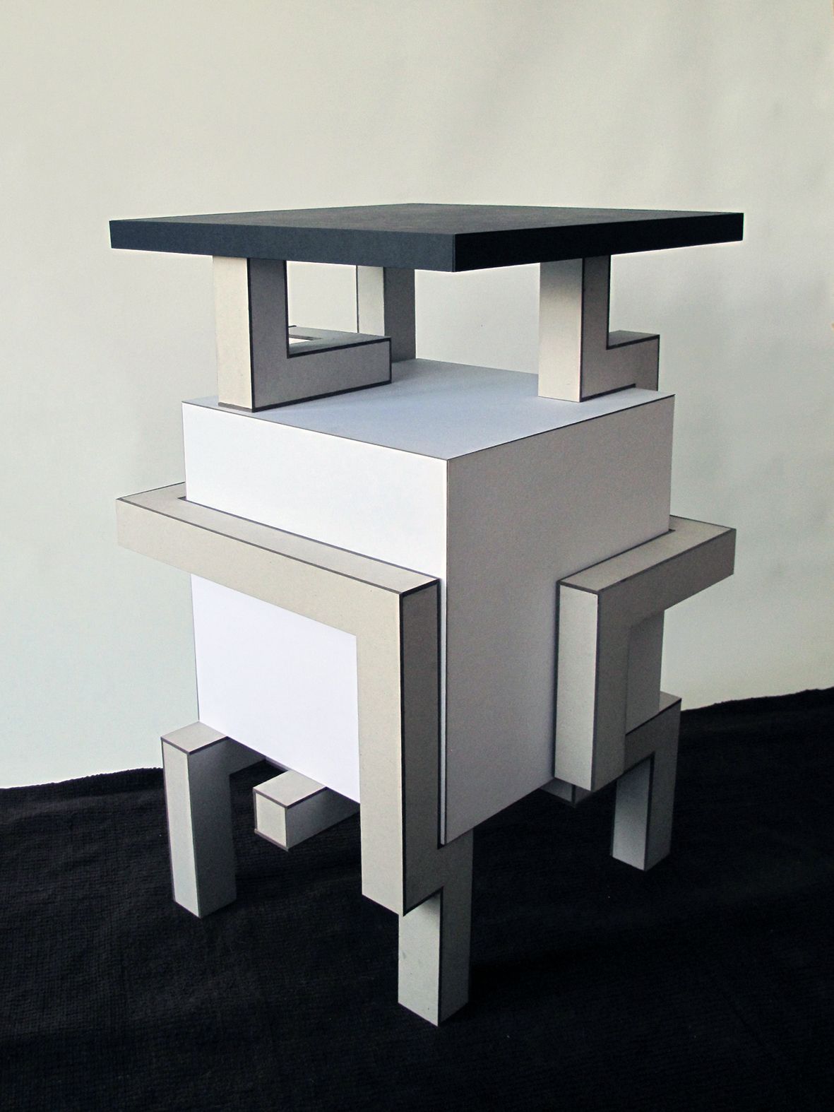 Deze vorm ontstond tijdens een vakantie in het plaatsje Pléboulle in Frankrijk. Er was geen specifieke aanleiding, ik was vormen aan het tekenen met in het achterhoofd kunst. Op het moment dat ik het had gebouwd voor toepassing bij een Kubiek, was het ook een tafel.